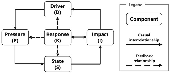 In the last century, the Organization of Economic Cooperation and Development developed the PSR (Pressure–State–Response) framework, and the European Environment Agency soon expanded it into the DPSIR (Driver–Pressure–State–Impact–Response) framework [26]. The DPSIR framework combines socioeconomic and environmental systems [27], adapting to the management of complex systems of urban development.