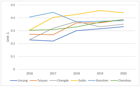 The data sources include the China Urban Statistical Yearbook, China Environment Statistics Yearbook, Statistical Bulletins of Cities, Statistical Yearbook of the Provinces, and China Torch Statistical Yearbook. We chose the statistics from 2016 to 2020 and considered these five years as the observation period since the approved dates of our study areas all focused on 2018 and 2019. Thus, the results of our research can reveal the developmental situations of the six cities before and after the policy was implemented to establish innovation demonstration zones. Furthermore, to show more clearly the differences before and after the implementation of the policy, we have extended the time frame by analyzing the situation of the indicator’s barrier degree from 2011 to 2015 as a complement to enriching the results of the experiment.