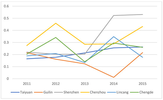 In addition, to show more clearly the development trend of the sustainable development level of cities, we extended the time range of the study by calculating the sustainable development level of six cities from 2011 to 2015, and the results are shown in Figure 4. The results show that the fluctuation in the sustainable development level of cities between 2011 and 2015 was greater and that development was more unstable.