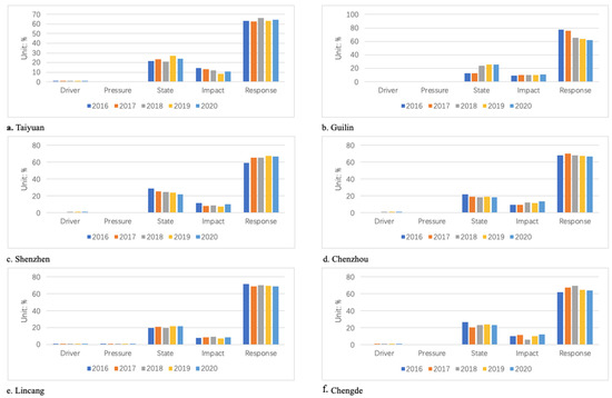 The entropy weights for each indicator are presented in Table 3, revealing that the indicators within the driver and pressure components exhibit lower weights than those within the state, impact, and response components. Furthermore, Table 4 displays the urban sustainability scores of cities annually, while Figure 3 illustrates their visual urban sustainability levels from 2016 to 2020. Over this five-year period, all six cities demonstrated a consistent increase in their urban sustainability levels except for Shenzhen, which experienced a decline from its top position among these cities due to a decrease in its score from 0.44296 to 0.36942 in 2017. Despite some subsequent efforts, Shenzhen’s current urban sustainability level ranks fourth among the study areas and was even inferior to its own level in 2016. In contrast, Guilin maintained the top 1 urban sustainability level from 2018 to 2020 by continuing inputs in urban development. Although it slightly decreased in 2019, Guilin still maintained a higher urban sustainability level in 2020 than it did from 2016 to 2018. Shenzhen, as a coastal innovative city, represents a relatively high level of China’s reform and opening up plan. It focuses on the relative lack of resource and environmental carrying capacity and social governance support. By integrating various types of innovative resources and deepening mechanism reforms, Shenzhen explored effective models that can be implemented, replicated, and popularized to demonstrate the sustainable development of megacities. Guilin has always been famous for its favorable ecological environment and for addressing how to turn ecological resources into development advantages. Therefore, this study focuses on issues such as ecological restoration and environmental protection in karstic and rocky desertification areas, examining the effects on the realization of sustainable development in the multiethnic and ecologically fragile regions of central and western China.