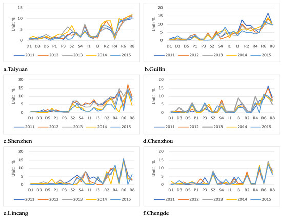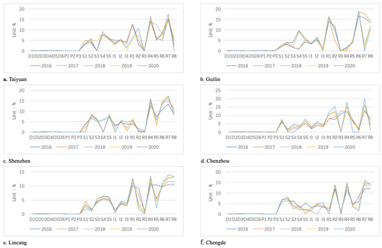 Overall, the key obstacle component is the response. All six cities every year experienced more than 60% obstacle degrees in terms of response, with the exception of Shenzhen, in 2016. In addition, although the performance of various cities can differ slightly in some aspects, the component with the greatest contribution to the state contributes approximately 20% of the obstacle degree, and the component with the greatest contribution to the impact contributes approximately 10% of the obstacle degree. The other components, including drivers and pressure, contribute little to the obstacles to urban sustainability. Notably, the obstacle degree contributions of each component did not fluctuate much over the five-year observation period, all within 10%. Delving deeper, there are similar trends in the obstacle indicators of various cities. All the study areas (except Guilin) experienced relatively high obstacle degrees in terms of the two indicators of finance budget expenditures (R4) and R&D internal expenditures (R7), each of which contributed 10%~20% of the obstacle degrees each year. Furthermore, the obstacle degree contributions of these two indicators increased over time during the observation period. Unlike other cities in the study area, Guilin, with respect to urban sustainability, scored in the top 1 from 2018 to 2020, identifying the key obstacle indicators in health facilities (R1) and beds in medical institutions (R6). These findings indicate that the main problem in the urban sustainability of Lincang, Taiyaun, Chengde, Shenzhen, and Chenzhou is expenditures from governments and other organizations, whereas the main sustainable developmental problem of Guilin is healthcare. In addition to the problem of expenditures faced by almost all cities, Taiyuan’s shortage of health facilities (R1) was not released until 2019, but in the same year, the obstacle to the utilization of industrial solid waste (R2) began to increase. The industrial solid waste utilization (R2) in Chenzhou was also in the same predicament as that in Taiyuan and was even more serious because of the doubling of the obstacle degree during the five years. Furthermore, although the obstacle degree of R&D personnel input (R8) in Shenzhen tended to decrease during the observation period, it was still relatively high (8–12%). Sewage treatment (R5) has made impressive progress in Lincang since 2017, and its degree of obstacles reached nearly 2% in 2020 from over 10% in 2016. However, the obstacle degrees of health facilities (R1) and R&D personnel input (R8) in Lincang were high (over 10%) initially in 2016 and tended to continuously increase, as did the obstacle degrees of industrial solid waste utilization (R2) and R&D personnel input (R8) in Chengde. Notably, the urban sustainability level top 1, Guilin, also had a problem with R&D personnel input (R8), similarly to Shenzhen, Lincang, and Chengde. Although the obstacle degree of R&D personnel input continuously decreased during the five years, it was still greater than 10%. In addition, medical insurance (S4) suddenly became an impressive obstacle indicator in Guilin since 2018, and its obstacle degree was close to 10% in 2020.