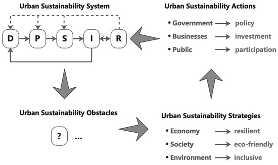 To pursue urban sustainability, we developed a model for various stakeholders of cities on the basis of the methodology of the DPSIR framework and obstacle identification. As shown in Figure 8, the model comprises four interconnected components: the urban sustainability system, urban sustainability obstacles, urban sustainability strategies, and urban sustainability actions. Distinctive urban impediments are discerned within the context of the urban sustainability system, thereby engendering the formulation of commensurate strategies in response to varying impediments. These strategies, in a cascading manner, guide the execution of judiciously tailored actions. The ripple effects of these actions permeate the developmental trajectory of the urban sustainability system within the urban milieu, orchestrating a perpetually evolving equilibrium through feedback loops [53].