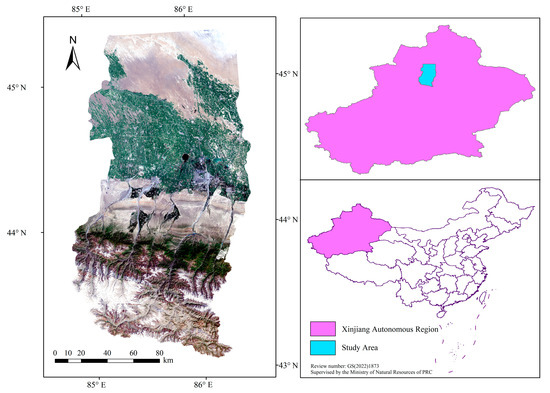 The Manas River Basin is located in northwest China’s Xinjiang Uygur Autonomous Region. The Manas River originates from the northern foot of Mount Ilianhabirga in the Tianshan Mountains and flows toward Manas Lake in the Gurbantunggut Desert (Figure 1). The basin is the core area of the northern slope economic zone of the Tianshan Mountains and the largest oasis agricultural area in Xinjiang [25]. The annual average precipitation is approximately 150–200 mm with an average temperature of 6.8 °C. The interannual temperature difference can reach 80 °C, which is characteristic of a temperate continental climate. The terrain is relatively high in the southern region and relatively low in the northern region with an average altitude of 366–407 m. The sequence of land cover types along the Manas River from southwest to northeast includes alpine snow, alpine meadow, mountain coniferous forest, mountain desert steppe, agricultural oasis, and temperate desert [26]. The vertical zonality is evident, as it is a typical mountain–oasis–desert ecosystem.