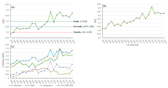 Ecosystem health conditions. (a) CC-PSR ecosystem health index; (b) conventional PSR ecosystem health index; (c) pressure, state and response indices.