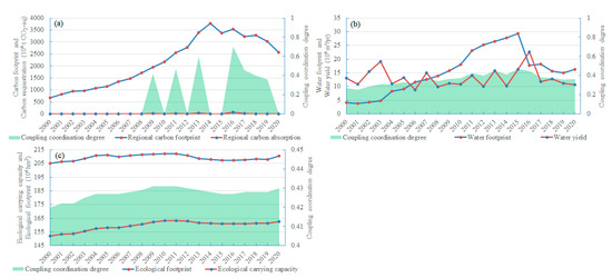Carbon footprint, water footprint, and ecological footprint and their corresponding carrying capacity. (a) Carbon footprint—carbon absorption capacity; (b) water footprint—water yield and coupling coordination degree; (c) ecological footprint—ecological carrying capacity and coupling coordination degree.