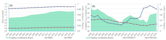 Calculation results of the landscape ecological index. (a) SHDI—SHEI and their coupling coordination degree; (b) CONNECT—CONTAG and their coupling coordination degree.