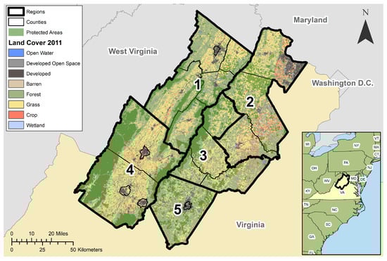 Study region and five subregions within Virginia, USA and land use and land cover in 2011.