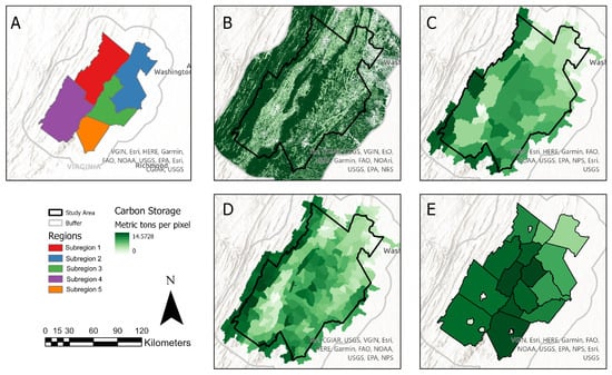 (A) Map of study area and 5 km buffer. The five subregions are reflective of social and environmental factors. Amount of stored carbon in the study region summarized by (B) 30 m pixel, (C) land–river segment, (D) watershed, and (E) county.