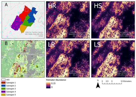Change in summer abundance of Halictidae across the four scenarios (HR, HS, LR, and LS). (A) Study region with AOI. (B) Distribution of crops within the AOI (red = apples, pink = alfalfa, other crops are not bee pollinated). Data drawn from Cropscape.Pollinator abundance is a measure of the per-pixel abundance of a given species.