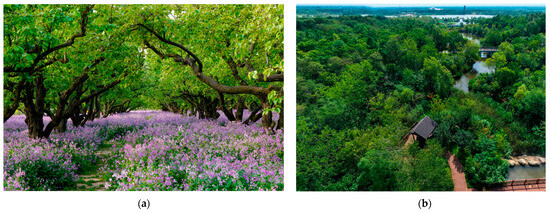 The depictions of the Santai Mountain NFP in Jiangsu: (a) Flowers; (b) Woods; (c) Landscape Corridors; and (d) Water Features.