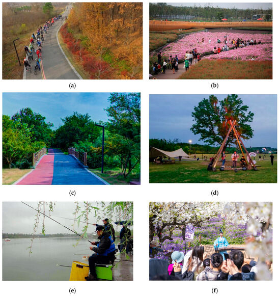 User activities in the Santai Mountain NFP, Jiangsu: (a) cycling; (b) flower-viewing; (c) walking; (d) music appreciation; (e) fishing; (f) watching a performance; (g) viewing platform; (h) camping; (i) agricultural sales; (j) children’s playground.