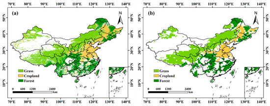 Masking results at different resolutions for China’s terrestrial ecosystems. (a) is the map with a resolution of 0.05°; (b) is the map with a resolution of 0.5°.
