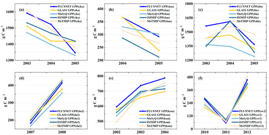 To verify the accuracy of the model and remote sensing data in estimating GPP, this study utilized observation data from flux towers in China, comparing them with the model and remote sensing data for validation. The flux tower data can be accessed at https://fluxnet.org/, accessed on 23 June 2024. The methodology involved obtaining GPP observation data from the flux towers and determining their corresponding longitude and latitude. These coordinates were then used to locate the matching grids in the model and remote sensing data, from which data for the same years were extracted for comparison and analysis. The results (Figure 3) indicated that the GPP values from the flux tower data closely match those from the model and remote sensing data, exhibiting similar variation trends. This concordance verified the accuracy and reliability of the model and remote sensing data used in this study.