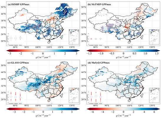 When comparing the interannual changes in GPPmax of China’s terrestrial ecosystems, differences emerged between the model and remote sensing GPPmax. Specifically, the GPPmax values from MsTMIP for cropland and forest were lower than those from the other three data sources, but overall, there was a more consistent fluctuating increase (Figure 7). Grassland GPPmax ranges from 60 to 120 g C m−2, while cropland GPPmax typically ranges between 180 and 240 g C m−2, with the exception of the MsTMIP dataset. Forest remote sensing GPPmax remained relatively constant at approximately 250 g C m−2. Most grassland areas and cropland as well as forest, except for individual data from a few regions, exhibited GPPmax growth rates exceeding 0.15 g C m−2 year−1, 0.09 g C m−2 year−1, and 0.18 g C m−2 year−1, respectively.