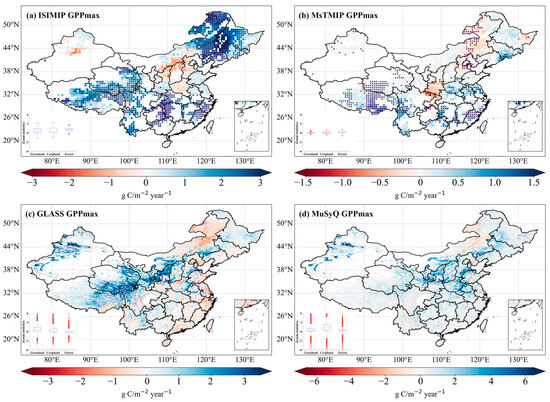 Spatial patterns of GPPmax changes in China’s terrestrial ecosystems over the past four decades based on model and remote sensing observations. (a,b) are the direction and magnitude of GPPmax changes averaged by the multi-model combinations of ISIMIP and MsTMIP, respectively. The dots in the graph represent that this point passes the significance test of p < 0.05. (c,d) are the direction and magnitude of GPPmax changes driven by GLASS and MuSyQ datasets, respectively. The regional average trend values are counted as box plots in the lower left corner. Data points that are more than 1.5 times the interquartile range of the first and third quartiles are marked as outliers, which are indicated by red dots in the figure.