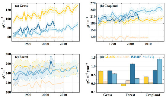 The absolute variation in GPP values across different sources was relatively large (Figure 5), yet the overall trend was upward, reflecting the inter-annual fluctuations of different vegetation types in China’s terrestrial ecosystems. Grassland GPP growth rates in China ranged from 0.23 to 3.16 g C m−2 year−1 and cropland GPP growth rates in China ranged from 0.40 to 7.32 g C m−2 year−1; the forest GPP in China exhibited the most pronounced increasing trend, with an average growth rate ranging from 0.67 to 7.81 g C m−2 year−1 (Figure 5d). We observed a higher increasing rate in GPP in cropland compared to grassland. The increase in cropland GPP is closely linked to human activities. In recent years, modern farming practices like precision irrigation, optimal fertilization, and the cultivation of high-yield crop varieties have significantly enhanced photosynthetic efficiency and GPP [31]. Furthermore, climate change, including warmer temperature, longer carbon uptake period, and higher CO2 concentration, has also occurred. Cropland is more sensitive to temperature and CO2 levels [32], resulting in a higher GPP increase compared to grassland. In summary, both model-based and remote sensing-based spatial and temporal analyses confirmed a significant increase in GPP across China’s terrestrial ecosystems over the last four decades, and these ecosystems have become more efficient carbon sinks compared to the previous century.