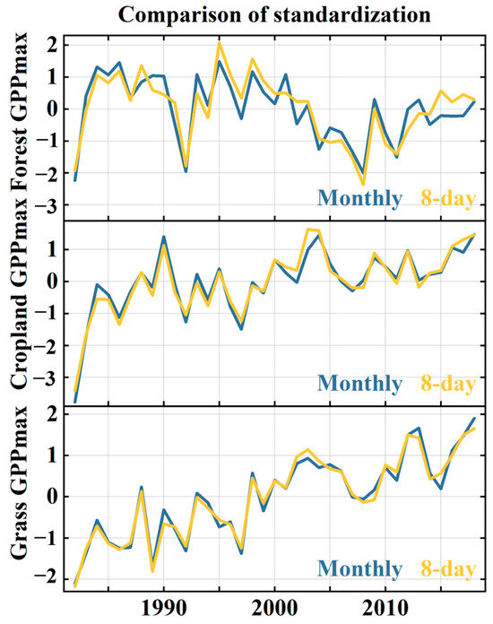 In this study, prior to assessing the impact of plant phenology and physiology on interannual GPP, we conducted a comprehensive analysis of the temporal and spatial variations in GLASS GPPmax at both the 8-day and monthly scales. The standardized values of GPPmax over 8-day and monthly periods exhibited consistent trends, validating the suitability of the GLASS GPPmax dataset for subsequent analyses at an 8-day temporal resolution (Figure 8).
