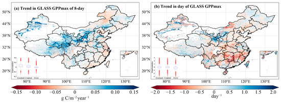 Next, we examined the spatial variation characteristics of 8-day GPPmax and observed a pronounced increase in China’s terrestrial ecosystems’ GPPmax. The average inter-annual variability of GPPmax was 0.026 g C m−2 year−1, 0.018 g C m−2 year−1, and -0.04 g C m−2 year−1 for grassland, cropland, and forest, respectively. In particular, the increasing trend was evident in the grassland of the Loess Plateau, the grassland of Tibetan Plateau, and the cropland of North China Plain (Figure 9a), where the GPPmax growth rate exceeded 0.1 g C m−2 year−1 in most of these regions. This could be attributed to significant vegetation restoration projects on the Loess Plateau, gradual climate warming and humidification on the Tibetan Plateau, and agricultural expansion on the North China Plain, all contributing to a faster increase in GPPmax in these regions compared to others [33,34]. Upon comparing GPPmax changes over the past four decades, the emergence date of GPPmax in Chinese grassland, cropland, and forest has not significantly shifted, except for a slight delay in some Loess Plateau grassland and an earlier emergence in the grassland of Inner Mongolia and the forest of southern China (Figure 9b). In summary, 8-day GPPmax served as a reliable indicator of peak ecosystem productivity, allowing for the construction of stable metrics using GLASS GPPmax to assess the influence of plant physiology and phenology on interannual GPP in subsequent analyses.