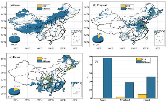 Results of the partial correlation analysis of the GLASS dataset (yellow indicates that the GPP trend change is controlled by CUP, blue indicates that the trend change is controlled by GPPmax). (a–c) are the results of partial correlation analyses for China’s terrestrial ecosystems, respectively. (d) is the proportion of CUP and GPPmax in the three ecosystems controlling changes in GPP.