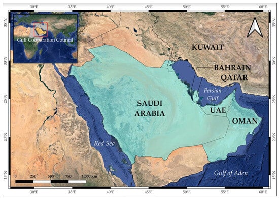 The GCC countries consist of Saudi Arabia, the United Arab Emirates (UAE), Qatar, Oman, Bahrain, and Kuwait (Figure 1). They occupy most of the western Arabian Peninsula, the Arabian Gulf to the east, and the Gulf of Oman to the southeast, adjacent to the other Middle East countries. The desert climate in the GCC countries is characterized by high temperatures of up to 50 °C, very low rainfall, and low humidity [44,45]. Although the terrain across the GCC countries is predominantly semi-arid to hyper-arid desert, many coastal areas are home to mangrove forests [25].