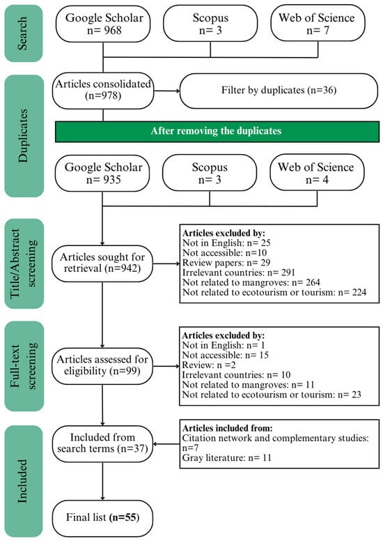 This study follows the Preferred Reporting Items for Systematic Reviews and Meta-Analysis (PRISMA) guidelines [46] to document systematic reviews. We used the Google Scholar and Google search engine, Scopus, and Web of Science (WoS) databases to find articles related to mangrove ecotourism in the GCC. The reviewed articles covered all the countries in the GCC region, where the number of articles found varied per country and scale of study. Our search was limited to results on published documents in the English language from January 2010 through December 2023. The search strings used in the search expression consisted of defined criteria and keywords in English (Table 1). We conducted a code-based search query on Google Scholar using Python on the following website (https://serpapi.com/google-scholar-api) accessed on the 12 October 2023, and we examined the first 10 Google Scholar pages, resulting in 1000 articles (100 articles per page) because, beyond that, relevant articles are usually no longer retrieved [47]. This was complemented with a manual search through citation and reference networks to identify as many relevant articles as possible [47]. The searches utilized primary terms and their synonyms, as identified through Thesaurus functions (see Table 1). Additionally, search strings were tailored to accommodate the varying wildcard symbols (e.g., word truncation [*]) required by different databases.