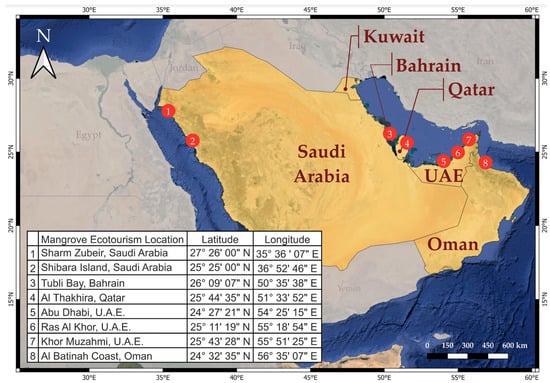 Mangroves play a crucial role in promoting ecotourism in the Gulf Cooperation Council (GCC) region, encapsulating the values of conservation and development, offering unique and biodiverse landscapes that attract tourists seeking immersive nature experiences [8,9,10,11,12]. Ecotourism is widely seen as beneficial, focusing on nature and nature conservation, education, environmental preservation, and societal progress [13,14,15,16]. It is considered a positive economic pursuit for sustainability and is often discussed in connection with sustainable livelihoods [17,18]. The GCC countries recognize the importance of conserving their diverse ecosystems, such as deserts, mountains, sabkhas, and coastlines, to attract tourists [19,20]. Saudi Arabia and the UAE have witnessed significant ecotourism growth by promoting desert recreational activities and national parks [20,21], and Oman has become a leading hub for ecotourism, focusing on wildlife and attracting niche markets [17,22]. As tourists increasingly prioritize sustainable tourism and meaningful experiences, the GCC countries are integrating eco-friendly and cultural practices and promoting responsible tourism via regional policies [21]. This shift aligns with the region’s commitment to sustainability initiatives and educating residents and tourists about responsible tourism [21]. The ecotourism in the region has lately been enhanced by the development of smart cities such as the Neom Region and giga-projects dedicated to tourism, such as Red Sea Global (RSG) and the Royal Commission for Alula in Saudi Arabia. Thus, in the GCC countries, ecotourism has emerged as a key component of the region’s economic diversification strategy since the early 2000s, targeting environmentally conscious tourists [20].