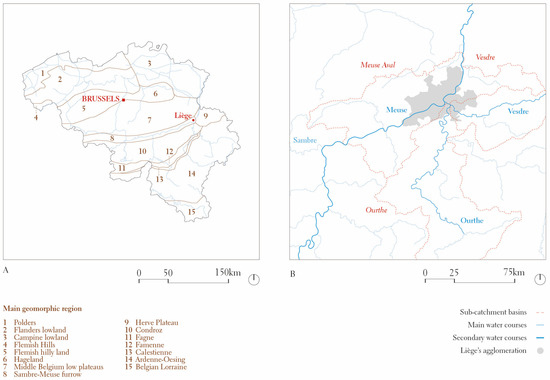 Liège’s position in relation to main geomorphic region of Belgium and Luxemburg (A) and in relation to the Meuse Aval, Ourthe, and Vesdre hydrographic sub-basins (B).
