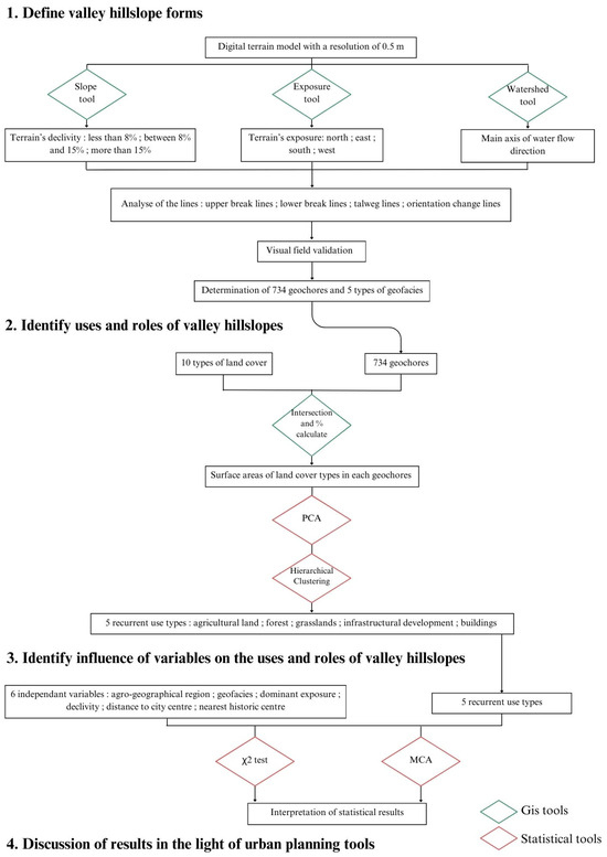 This research revisited the geochore approach developed in the last century by introducing GIS, factorial analysis, Lidar, and precise land cover information, which greatly facilitated the use of the concepts and approach. It provides and tests a method that focuses on valley hillslopes to analyse their diversities and uses, in order to question their role in the urban metabolism. The research premises show little consideration for the analysis of slopes from a planning perspective in the literature and existing planning documents.