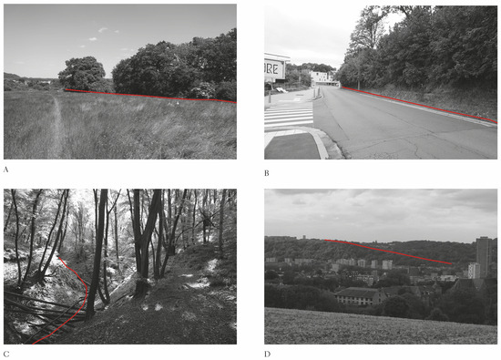 Examples of characteristic slope lines perceived during surveys around Liège’s conurbation. (A) Upper break line towards the top of the plateau; (B) lower break line towards the valley area; (C) talweg line; (D) line of change of exposure or orientation.