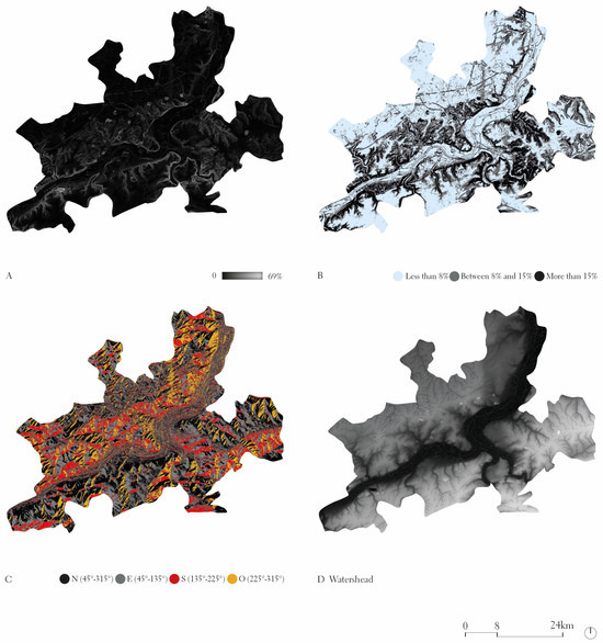While remaining bound to a digital dimension, the model’s interpretation is filtered through definitions of characteristic lines, which are effectively perceived through in situ observation of the morphology around Liège’s conurbation (Figure 3). To investigate the terrain’s declivity, to each model’s pixel is assigned a declivity percentage (Figure 4A), then declivity is classified into three categories: terrain with declivity less than 8%, terrain with declivity between 8% and 15%, and terrain with declivity greater than 15% (Figure 4B). To investigate terrain’s exposure, the model is assigned orientation according to assigned cardinal coordinates. Specifically, to the north for an interval between 315° and 45°, to the east between 45° and 135°, to the south between 135° and 225°, to the west between 225° and 315° (Figure 4C). Finally, water runoff is identified through the Watershed function, which is useful for revealing the main axis of water flow direction (Figure 4D).