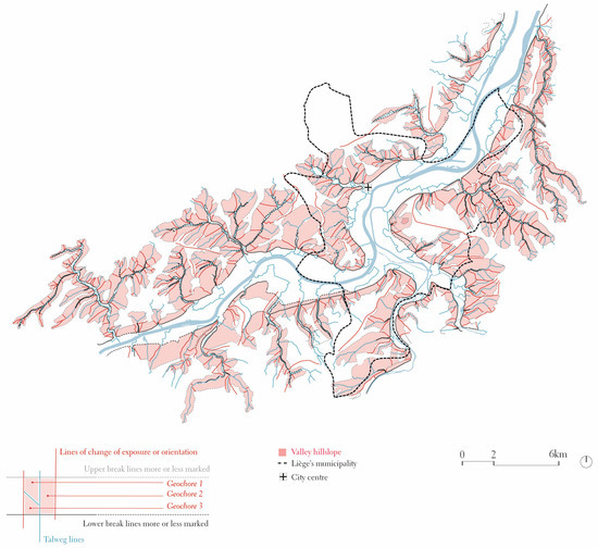 A geochore identified by overlapping characteristic lines can be grouped into further reference groups. According to exploration context’s characterisation [57,58] and with reference to the agro-geographical regions [59], the units interacting with the Condroz Ardennais are grouped, distinguishing them from those interfacing with Plateau de Herve and the Plateau Hesbignon (Figure 6A). To the north and the west, 46.7% of the geochores interact with a vast, gently undulating plateau dotted with dry valleys, whose altitude gradually decreases towards the north and northwest. Cultivated as far back as the Neolithic period thanks to its thick silt cover, Plateau Hesbignon is an agricultural region par excellence, with a characteristic landscape where traditional settlement is concentrated in large villages, with land stretching as far as the eye can see between inhabited areas and large square farms, testifying to the importance of agricultural activities. To the east, 31.9% of the geochores interact with Plateau de Herve, characterised by a clayey, impermeable soil, favouring the creation of rich pastures, once enclosed by a regular pattern of hedges—or bocage– which often supported orchards. Despite the removal of many hedges, it is still a region of pastures and pastoral economy, with scattered settlements. To the south, 21.4% of the geochores interact with the northern margin within which the Condroz folds are located. The name of this latter agro-geographic region—Condroz Ardennais—evokes its very character, as here, the conditions of the Ardennes are combined in areas where wet soils play no role in improving the terrain and where, consequently, the forest prevails. Liège, although predominantly developed on the northern slope towards Plateau Hesbignon, is in contact with different environments through the overall ensemble of geochores. Starting from Bertrand and Tricart’s [29] definition of geofacies—as physiognomically homogeneous compartments within the same whole—we also highlight the co-presence of different forms within the same valley’s hillslopes (Figure 6B).