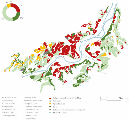 - Hélin, E. Traces du paysage rural ancien sur le territoire de la ville de Liège. Bull. Société Géographique Liège 1996, 32, 293–297. [Google Scholar]