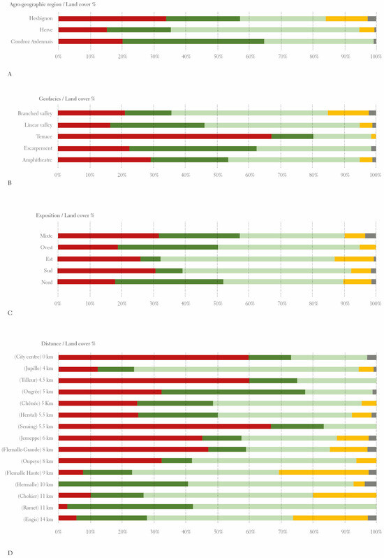 Geochore land cover cluster percentages in relation to agro-geographic region (A), geofacies (B), exposition (C), secondary historic centre’s distance from city centre (Place St.Lambert) (D).