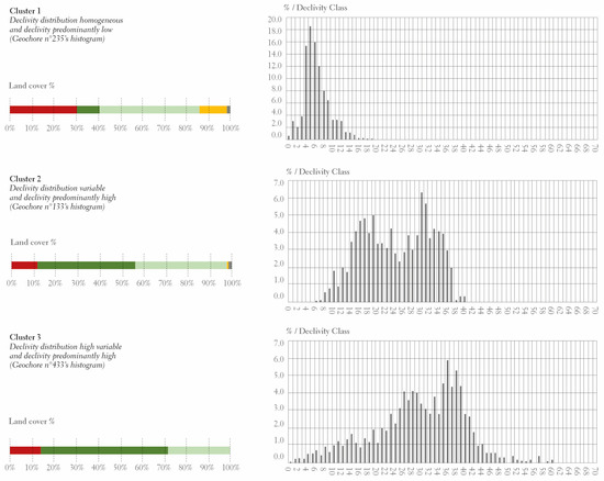 As for the previous two variables, a moderate interaction is revealed between geochore’s land cover and declivity (χ2 = 135.97; df = 6; p-value = 2.2 × 10−16, Cramer V = 0.3066). Therefore, the distribution and type of declivity (Figure 9) make it possible to distinguish a geochore subset that is more urbanised and has a grassland prevalence (Cluster 1) from two other clusters that are characterised by forest prevalence and a tendency towards the absence of agricultural land. However, even if very few geochores are found in “highly variable distribution and very high declivity”, it is interesting to note that higher declivity does not correspond to a lower percentage of urbanization, and that the forest percentages are similar in Clusters 2 and 3.