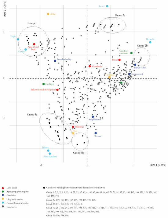 An MCA is conducted to better understand the relationships between the different variables selected to characterise slopes. The results of this MCA focused on the first two dimensions, representing 16% of the total inertia of the dataset. Indeed, these two dimensions synthesise the strongest relationships within the greatest diversity of variables (Appendix Figure A2(3)). The first dimension is associated with the relief and is correlated with the variable agro-geographic regions and to a lesser extent, with the variable geofacies. It ranges from Hesbaye and branched valley to Condroz Ardennais, linear valleys, and escarpments, with terraces and amphitheatres in an intermediate position. The second dimension is linked to the variable distance from Liège’s city centre and has a weaker correlation with the variable land cover. For the other dimensions, it is generally the same variables that are predominantly linked, or the correlations remain relatively weak, thus not allowing the emergence of new trends complementary to the previous results. In the factorial plane constructed by the first two dimensions, the positioning of geochores with the most significant contribution to the construction of these dimensions highlights four main geochore groups: the first dimension (horizontal axis) distinguishes the geochores of Group 1 from those of Groups 2a and 2b, while the second dimension distinguishes the geochores of Groups 3a and 3b (Figure 10). Considering that proximity between geochores on the factorial plane reflects a similar profile, and a geochore will be close to the modalities it possesses, geochores belonging to the same group generally show similar characteristics [49]. Thus, based on the position of the modalities of the active variables in relation to these five geochore groups in the factorial plane (Figure 10), we can highlight several relationships between the variables and identify various geochore profiles. The geochores that tend to be occupied by agricultural lands are the farthest from the city centre of Liège and are located on the Plateau Hesbignon (with the nearest historical centres being Chokier and Engis). These take the form of a branched valley (Group 1). Geochores that tend to be occupied by forests or grassland are located between 5 and 10 km from the city centre of Liège and take the form of an escarpment or a linear valley. Specifically, these geochores are located either on the Plateau de Herve (the nearest historical centre being Hermalle-sous-Argenteau) (Group 2a) or in the Condroz Ardennais (the nearest historical centre being Ivoz-Ramet) (Group 2b). As for geochores, generally dominated by built-up soil, these are located close to the city centre of Liège, with the nearest historical centres being Place Saint-Lambert and Tilleur. These generally take the form of a branched valley or an amphitheatre on the Plateau Hesbignon (Group 3a) or a terrace on the Plateau de Herve (Group 3b). The position of the infrastructural development near the Plateau Hesbignon at a medium distance from the city should also be underlined.