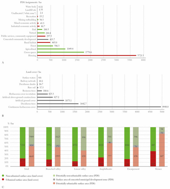 In particular, the intersection between the geochores’ surface area and the “Plan de Secteur” shows that more than half of the surface area (52%) is an urbanisable zone; therefore, in perspective, a greater percentage of geochores are potentially occupied by constructions. The percentage of 25% (Figure 7) is not properly comparable with 52%, as the first refers to geochores and the second to their surface. A closer investigation of the surface area, however, shows a real discrepancy between the plan’s indication and the actual valley hillslope’s use. According to “Plan de Secteur” (Figure 11A), the largest area corresponds to possible housing urbanisation (3721.3 ha), while according to the land cover (Figure 11B), it corresponds to continuous herbaceous cover (4948.0 ha). Furthermore, when summing up all the categories of plan indications referring to possible urbanisation, we reach a total area of 4643.2 ha. This amount does not correspond to the current area occupied by buildings or derived from urbanisation and infrastructural processes. According to the land cover—thus summing up the categories surface waters, railway network, bare soil, artificial ground cover, above-ground artificial construction—only 1754.5 ha is reached, which “Recreation”, “Mixed economic activity”, “Industrial economic activity”, “Public services, community equipment”, “Rural habitat”, “Housing” being less than half of the amount projected by “Plan de Secteur” (see total in Figure 11C).