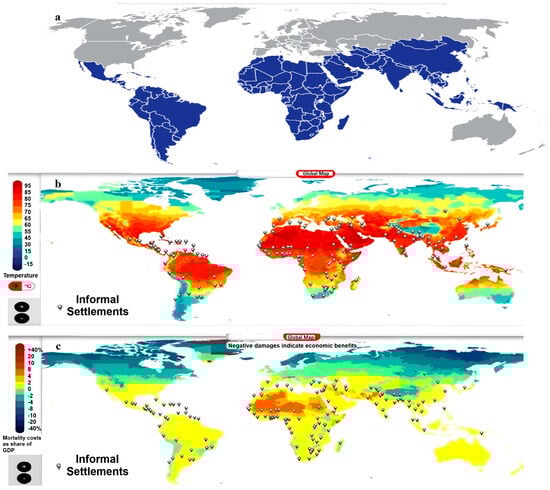 Global South, informal settlements, and climate impacts (2020–2039): (a) Global South regions; (b) global summer temperature map, highlighting high-impact regions; (c) mortality costs from temperature changes, with areas of increased susceptibility. Sources: [1,6,7].