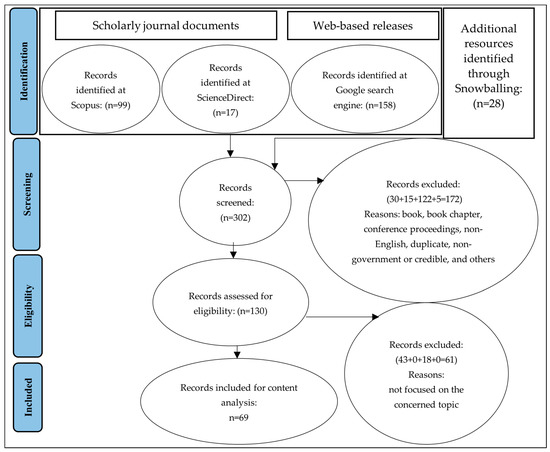 During the eligibility stage, the scholarly journal documents and web-based releases went through a more rigorous checking process where the titles, abstracts, and contents were carefully reviewed to make sure the criteria for inclusion and exclusion previously mentioned were followed and the study objectives were achieved. In this stage, a total of 61 items were excluded due to the lack of relevance to the current study or lack of details to respond to the objectives. After the screening and eligibility check, the total number of research sources was 69 (28 scholarly journal documents, 18 web-based releases, 23 resources identified through snowballing), and they were delivered to the content analysis stage.