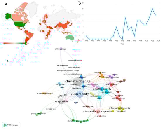 The distribution of scholarly journal resources screened for this study suggests a notable concentration of investigative efforts on the study’s keywords in countries of the Global North, such as the United States, United Kingdom, and Australia. The research sources timeline spans from 2000 to 2023, illustrating a broad temporal analysis. This timeline further highlights an escalating trend in research on climate risks, human settlements, and associated vulnerabilities over the last decade and a half, compared to previous periods. Furthermore, the co-occurrence of author keywords correlates with the specific aims of this study, lending validity to the search outputs from the systematic literature review. The three predominant keywords that emerged were ‘climate change’, ‘vulnerability’, and ‘adaptation’ (Figure 3). The strong interconnection between ‘climate change’ and the other two key terms, ‘vulnerability’ and ‘adaptation’, underscores the intrinsic linkage. This association further validates the premise that various climate change risks expose settlements to a spectrum of vulnerabilities, necessitating tailored adaptation strategies. ‘Adaptation’ in this context refers to the process, actions, or changes made to effectively manage the adverse impacts of climate risk factors on human settlements, particularly informal ones.
