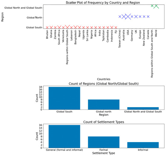 Building on the content analysis, a descriptive analysis was conducted to gain a deeper understanding of the geographical distribution of the records included in the current study. The analysis revealed notable patterns (Figure 5). Despite the Global North being represented by eight unique entities in the dataset, a significant portion of the documents were focused on just two countries within it: the USA and Australia. Together, these two countries were the focus of 11 studies, suggesting a concentrated research interest. In contrast, the Global South, despite having a larger representation in terms of unique entities, exhibited a dispersed focus with fewer studies dedicated to individual countries. This highlights a critical research gap. While studies on climate risks in the Global North (DCs and formal settlements) tend to focus on specific countries, research on the Global South (DevCs and LDCs) is less concentrated, leading to the potential neglect of country-specific risks and vulnerabilities [14]. This research concentration mirrors the findings of Klingelhöfer et al. [39], who noted the robust research infrastructure and the depth of climate change research in the Global North, as compared to the Global South. In addition to the geographical difference, the descriptive analysis also underscores a significant imbalance in the focus on settlement types in the examined documents. Most countries and regions tend to revolve their focus around settlements classified as “General” (incorporating both formal and informal) (n = 16; 57.1%) or formal settlements (n = 8; 28.6%). In contrast, the attention given to informal settlements appears markedly less (n = 4; 14.3%). This discrepancy illuminates the relative neglect of informal settlements, concentrated in the Global South, in climate risk studies [9,40]. Importantly, this neglect in investigations further extends to household-level attributes within informal settlements, which can be key causative agents of differential vulnerabilities. The scope of these rarely studied household-level vulnerabilities within informal settlements may encompass environmental aspects (sensitivity to environmental impacts), economic conditions, social factors, disease susceptibility (protective functions of households), and vulnerabilities related to the labor force (affecting productive functions) [41].