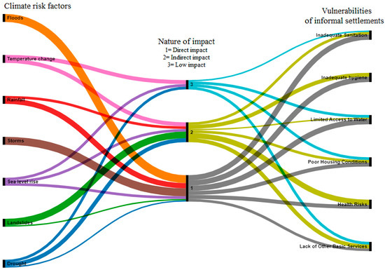 Exacerbating impacts of the climate risk factors on the vulnerabilities of informal settlements: an alluvial diagram visualization. Generated at https://app.rawgraphs.io/ (accessed on 10 March 2024).