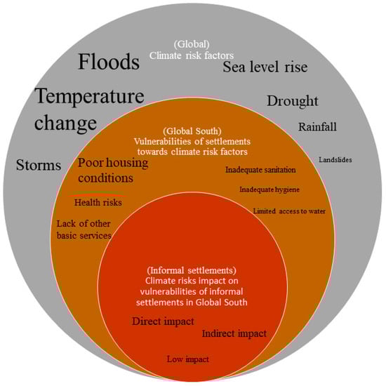 In countries typically grouped under the Global South, diverse community setups and residential patterns exhibit varying susceptibility to climate risks [5]. Informal settlements, where more than one billion people reside and form a significant part of the communities in the Global South, are characterized by distinct vulnerabilities to climate risks due to inherent challenges and infrastructural deficiencies (Figure 1) [1,6,7]. Within the scope of this study, ‘vulnerabilities’ of informal settlements refer to inherent weaknesses or susceptibilities within the settlements, aligning with what Chambers [8] terms ‘internal vulnerabilities’. Conversely, ‘climate risks’ such as floods, temperature fluctuations, sea level rise, and other extreme weather events represent ‘external vulnerabilities’. These settlements lack secure tenure, basic services, and infrastructure, leaving their residents disproportionately exposed and at risk [9]. The vulnerabilities of informal settlements are heightened by the interplay between the Global South’s inherent challenges, specific conditions within these settlements, and the escalating climate change threats. The complex dynamic between the Global South, climate risks, and informal settlements magnifies the existing trials faced by these communities and intensifies climate change effects, resulting in a reinforcing cycle of vulnerability [3,10]. A nuanced understanding of this complex interplay is lacking to devise effective mitigation strategies and enhance living conditions.