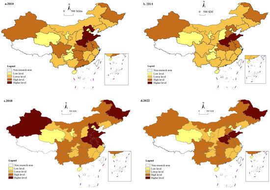 Figure 1 depicts the evolution in the spatio-temporal dynamics of agricultural carbon emissions at the provincial level in China in 2010, 2014, 2018, and 2022, categorizing the emissions into four tiers: low, lower, higher, and high. In terms of temporal evolution, in 2010, eight provinces had low agricultural carbon emissions, eleven had lower levels, eight had higher levels, and three had high levels. By 2022, this distribution had slightly shifted, with the number of provinces in the low-level tier dropping to six, the lower-level tier expanding to nine, the higher-level tier rising to twelve, and the high-level tier remaining at three. This chart demonstrates that overall agricultural carbon emissions in China were largely steady from 2010 to 2022. In terms of spatial distribution patterns, agricultural provinces in central and eastern China—such as Henan, Shandong, and Hebei—have largely produced higher agricultural carbon emissions. This aspect of the spatial distribution has grown more apparent over time, indicating a degree of agglomeration in agricultural carbon emissions rather than isolated distribution. This conclusion has implications for our collective understanding of the regional characteristics of agricultural carbon emissions and their dynamic evolutionary patterns.