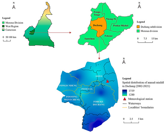 The study area is the municipality of Dschang, which is located in the Menoua Division, in the Western Region of Cameroon, between a latitude of 5°25′ and 5°30′ N, and a longitude of 9°57′ and 10°05′ E, covering a surface area of 262 Km2 (Figure 1). It is part of the Western Highland Agroecological Zone of Cameroon and has a humid tropical climate, with three main types, depending on the altitude, as follows: it is coastal at low altitudes like in Nteingue village near the Mbo plain, with increasingly hot weather; it is moderately cool in the mid-altitude zones (between 1200 and 1600 m); and it is temperate and increasingly cold at higher altitudes. This climate is characterized by a long rainy season from March to October, and a short dry season from November to February [13]. The mean annual rainfall for the period 1990 to 2022 is approximately 1680 mm, while the mean annual temperature stands around 20.8 °C. The municipality of Dschang consists of vast areas of arable land with various types of soil of high agricultural value. For this reason, this region’s economy is essentially driven by agriculture and relies on the following three main groups of crop types: perennial, food, and vegetable crops [13].