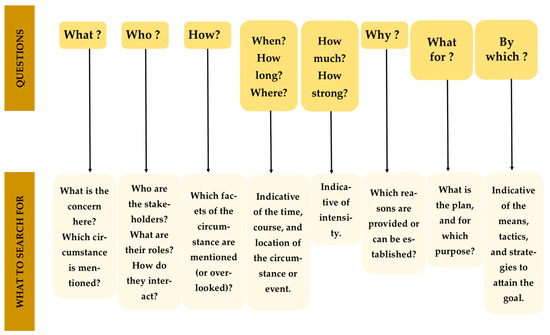 Flick’s list of basic questions used for coding strategies in qualitative analysis. Adapted from [23].