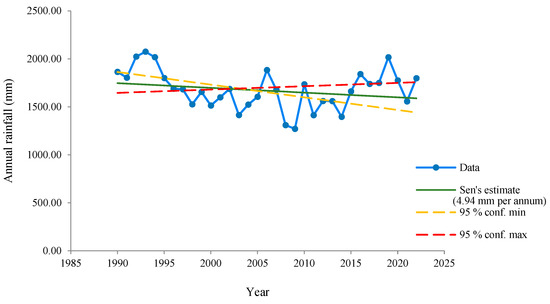 Results from the Mann–Kendall test for total annual rainfall from 1990 to 2022 showed a downward trend (with no statistical significance) (Table 1). The Sen’s slope (Q) test indicated that the total annual rainfall in the municipality of Dschang decreased at a rate of 4.94 mm per annum (Figure 4).