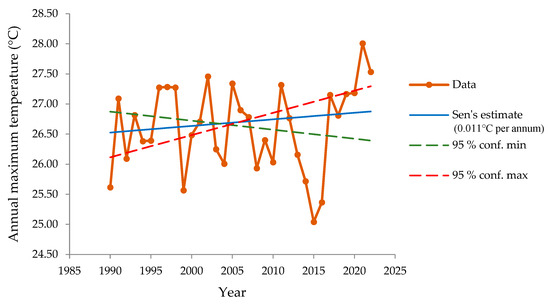The MK and Sen’s slope test results demonstrate that, on an annual basis, the maximum temperature is increasing (Figure 5) at a rate of 0.011 °C per annum (Table 2), with no statistical significance. This is an indication that, in the next 10 years, the increase in maximum temperature will be 0.11 °C, implying possible negative repercussions on the stages of maize cultivation for both the first and second cycles. According to [24], although temperatures ranging between 20 and 30 °C are necessary to initiate seed germination, a uniform temperature of 20 °C is optimal for the growth of maize seedlings. Hence, a consistent increase in maximum temperature over the years may negatively affect the maize plants’ development and growth.
