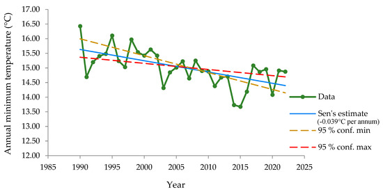 Minimum temperatures (Tmin) from 1990 to 2022 are decreasing (Figure 6) by 0.039 °C per annum (Table 2) as attested by the MK and Sen’s slope tests, with significance at 0.001 level of statistical significance. The months with the highest reduction in Tmin occur to be April (0.080 °C per annum) with significance at 0.01 level of statistical significance, and May (0.086 °C per annum) with significance at 0.001 level of statistical significance, respectively. April and May correspond to the sowing, growth, and maintenance stages of the first cycle of maize cultivation. According to [25,26], cited in [27] Mbiadjeu et al. (2021), maize requires a minimum temperature of 10 °C for active germination and at least 18 °C for flowering. Therefore, a steady decrease in minimum temperature may have unfavorable effects on maize growth in the next decades. Furthermore, the fact that several months show statistical significance indicates that minimum temperature has a potentially high influence on maize yield.
