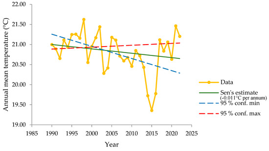 The outcome of the trend analyses showed that the mean temperature (Tmean) from 1990 to 2022 is decreasing (Figure 7) and the estimation of Sen’s slope (Q) gave a rate of decrease of 0.011 °C per annum (Table 2). March, April, and May exhibit the highest reduction in mean temperature with 0.04, 0.04, and 0.063 °C per annum, with significance at 0.01, 0.05, and 0.001 levels of statistical significance, respectively.