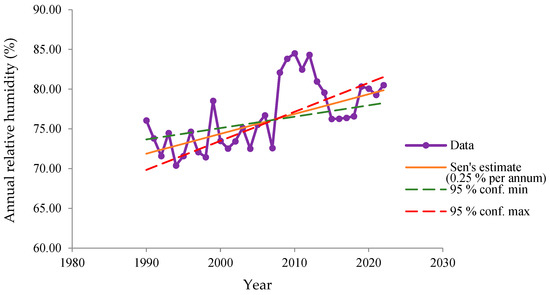 Summary of MK and Sens’s slope estimation for the mean of relative humidity (1990–2022).